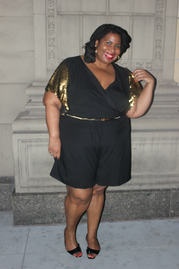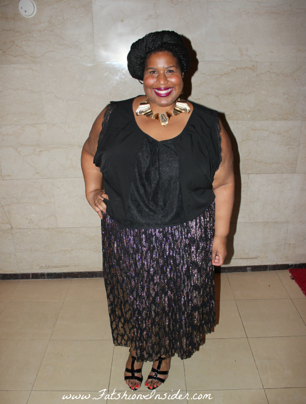 Above is what I wore to the Retailer’s show. Again black but a little lace, a little sparkle to keep it interesting. I love how this skirt photographs. The coloring is more gold but it appears purple on film. Lace top is from Old Navy, Necklace a gift from Morocco, Skirt ASOS Curve.
