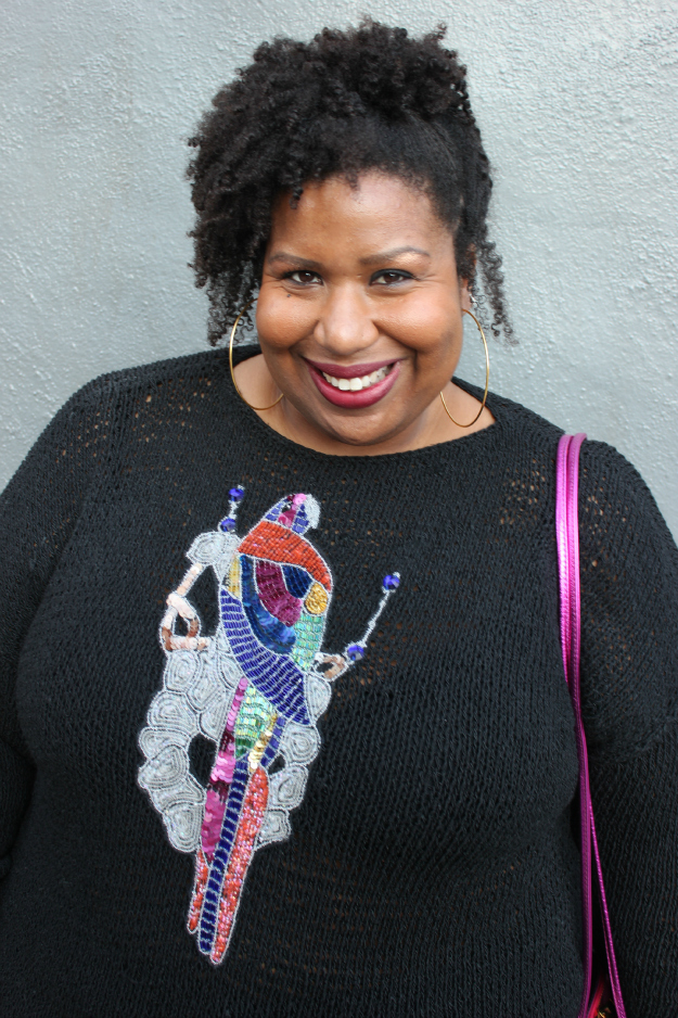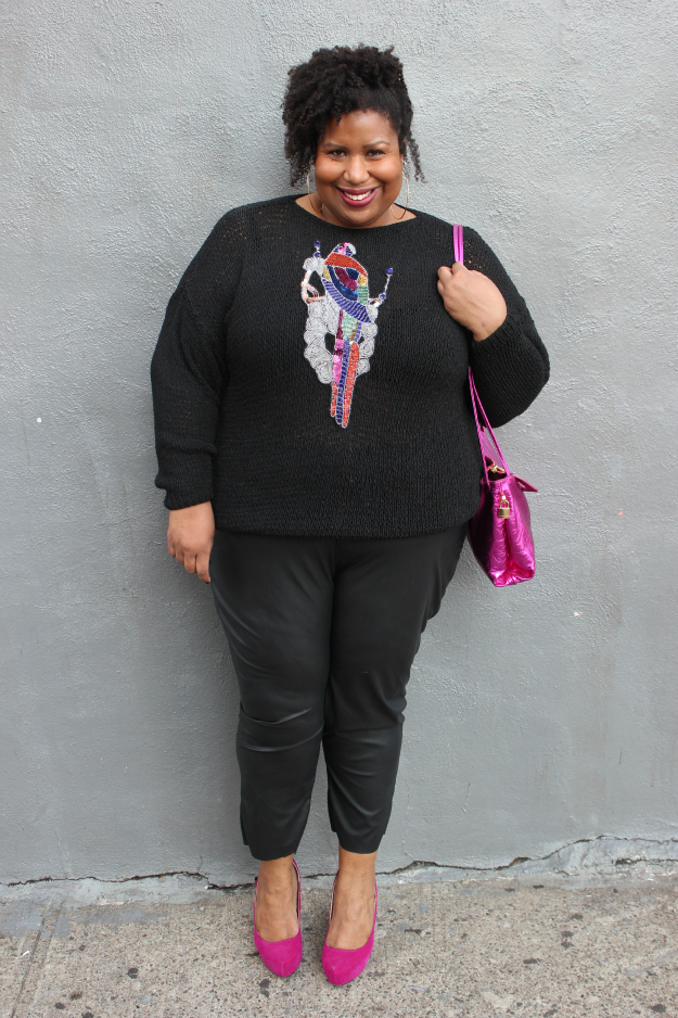 Plus Size Sequin Sweater: Vintage, Leather Jeans: Anna Scholz, Bag: Marc Jacob Collection, Pumps: Torrid