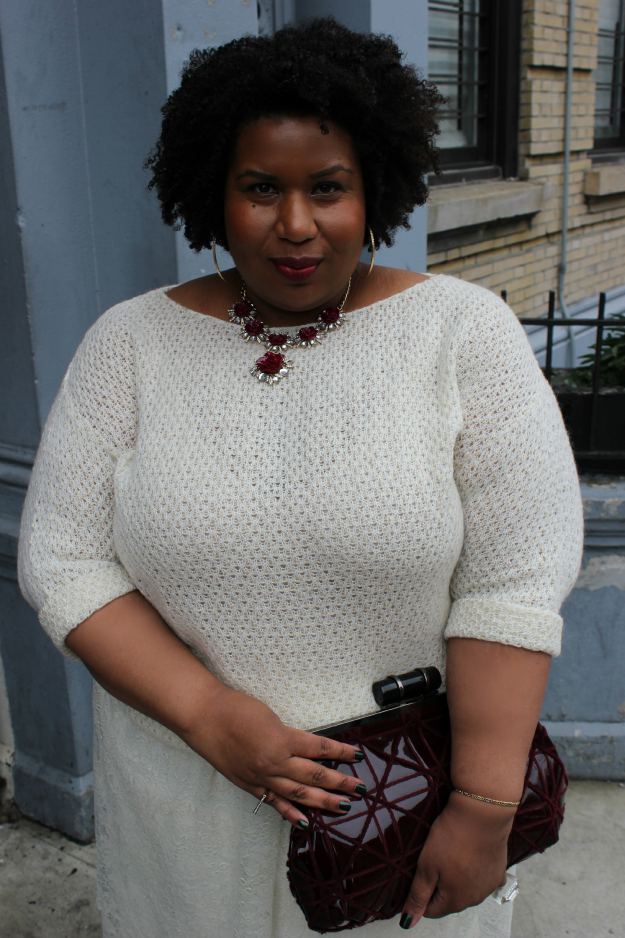 Sweater: c/o Lane Bryant (get it here), Skirt: Sunny Choi (old), Necklace: Forever 21, Bag via Off Saks