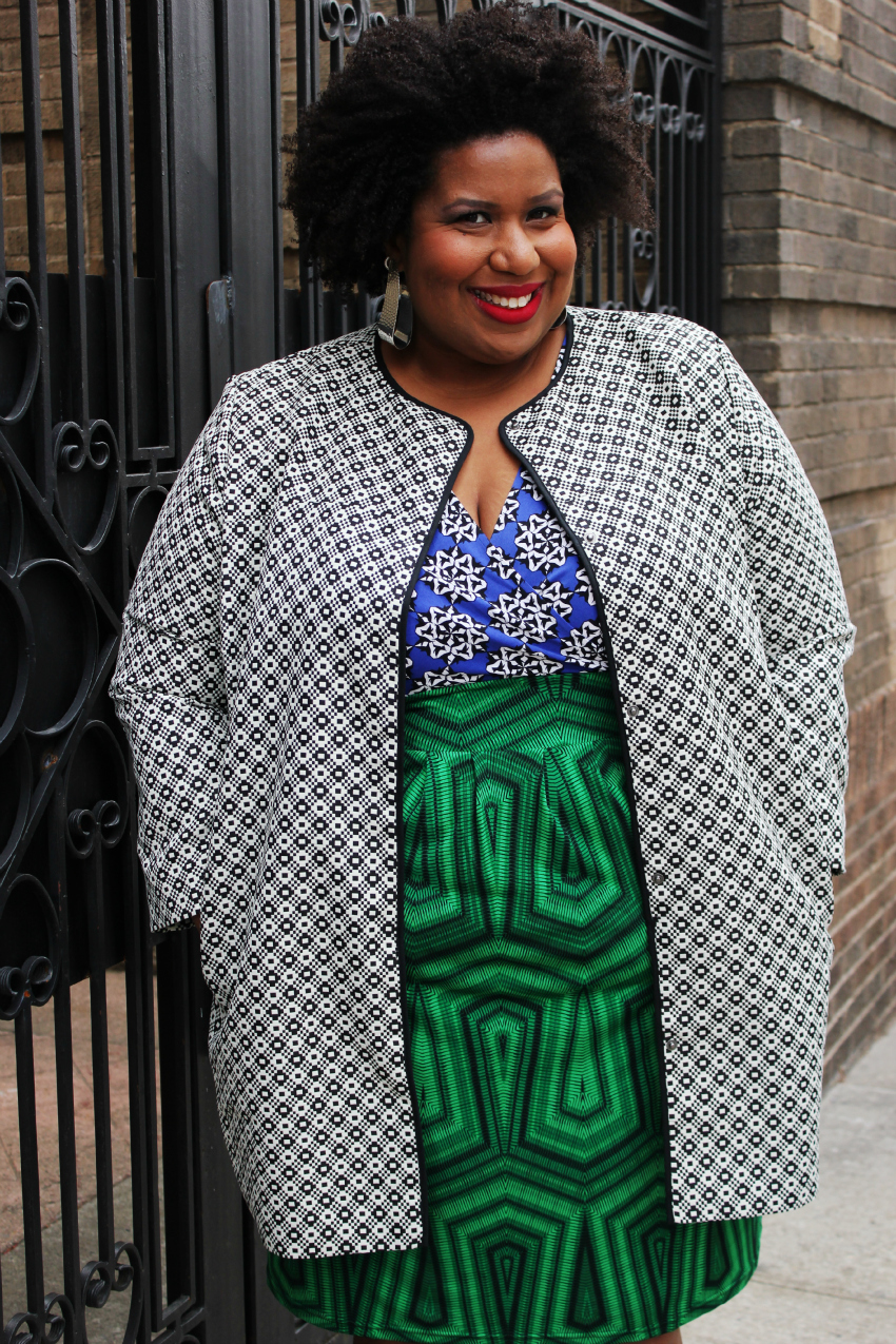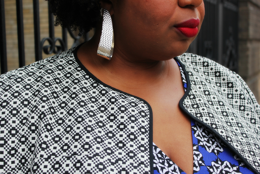 ASOS Curve Coat in Geo Pattern, Anna Scholz Print Dress c/o Simply Be, Blue Pumps (similar here)