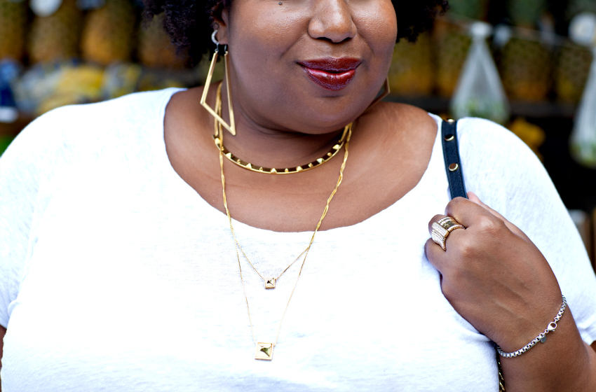 Triangle Hoop Earrings: Rachel Roy, Necklaces: Vince Camuto, Cross Bracelet: c/o Pura Vida