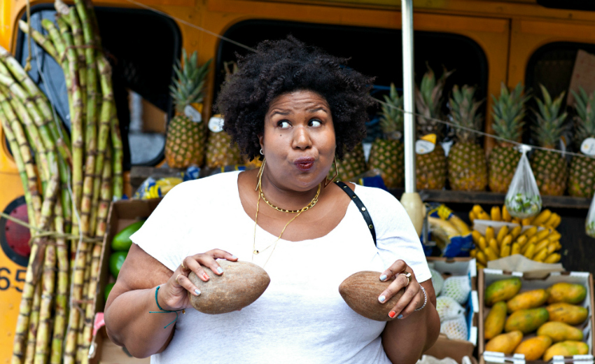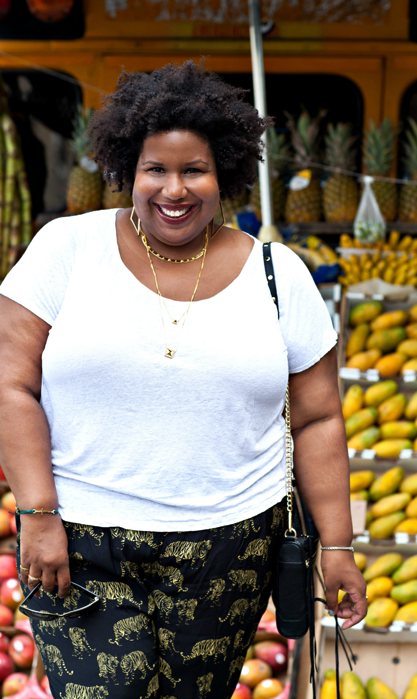 Sunglasses: Versace, Tee: Cynthia Rowley, Tiger Pants: c/o Simply Be, 5 Zip Bag; Rebecca Minkoff