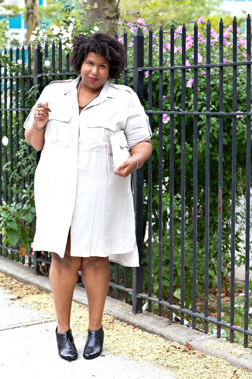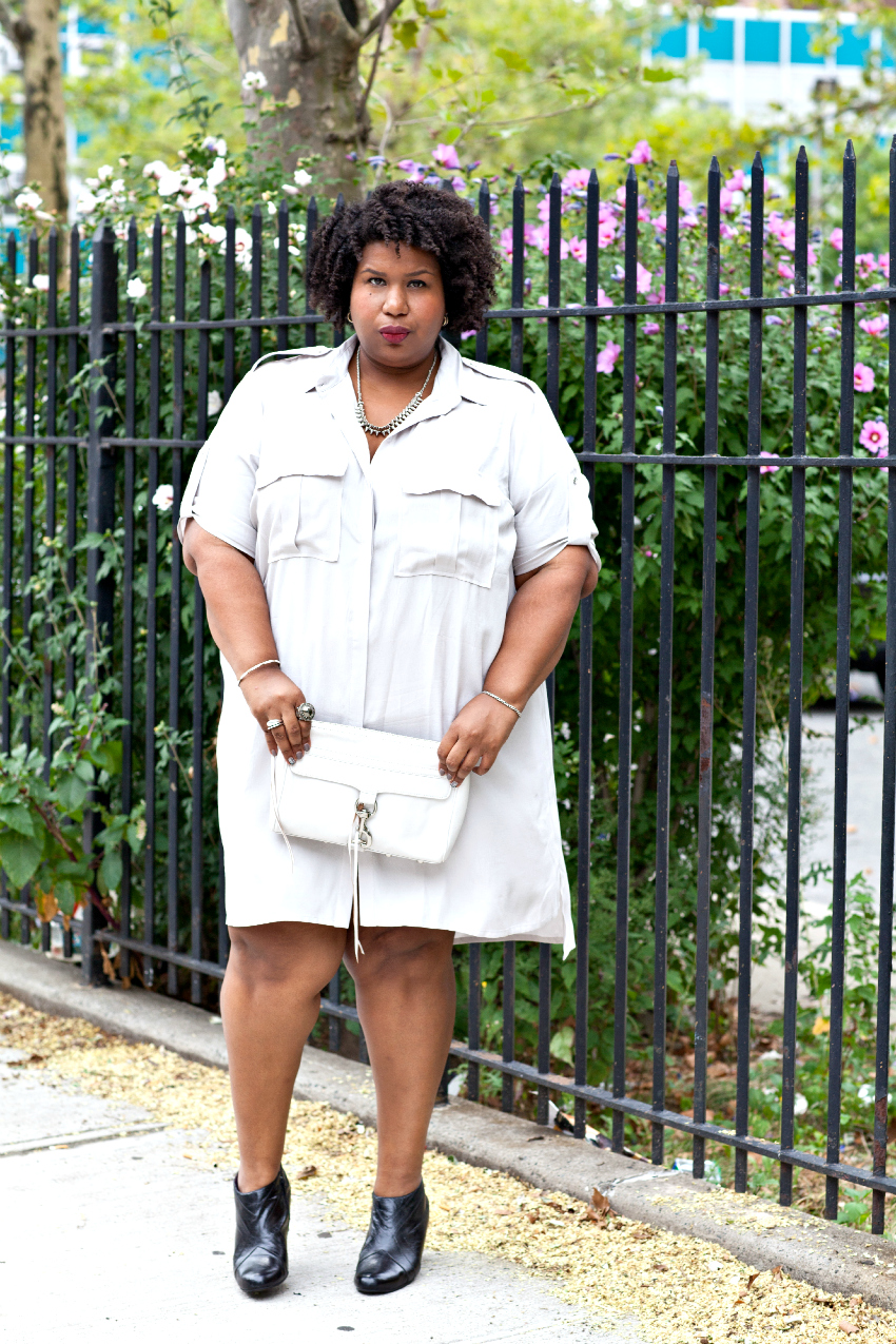 Yes, there are shirt dresses…there are even a few military inspired pieces but from what I’ve found, plus size shirt dresses tend to be a bit more Charlotte York (p.s. it’s kind of scary that a Sex in the City reference makes you jog your memory but it’s impossible for me not to see Kristin Davis pouting about an imperfect floral arrangement when I think of shirt dresses). You know the one, fit and flare, ribbon tie waist – blah blah.