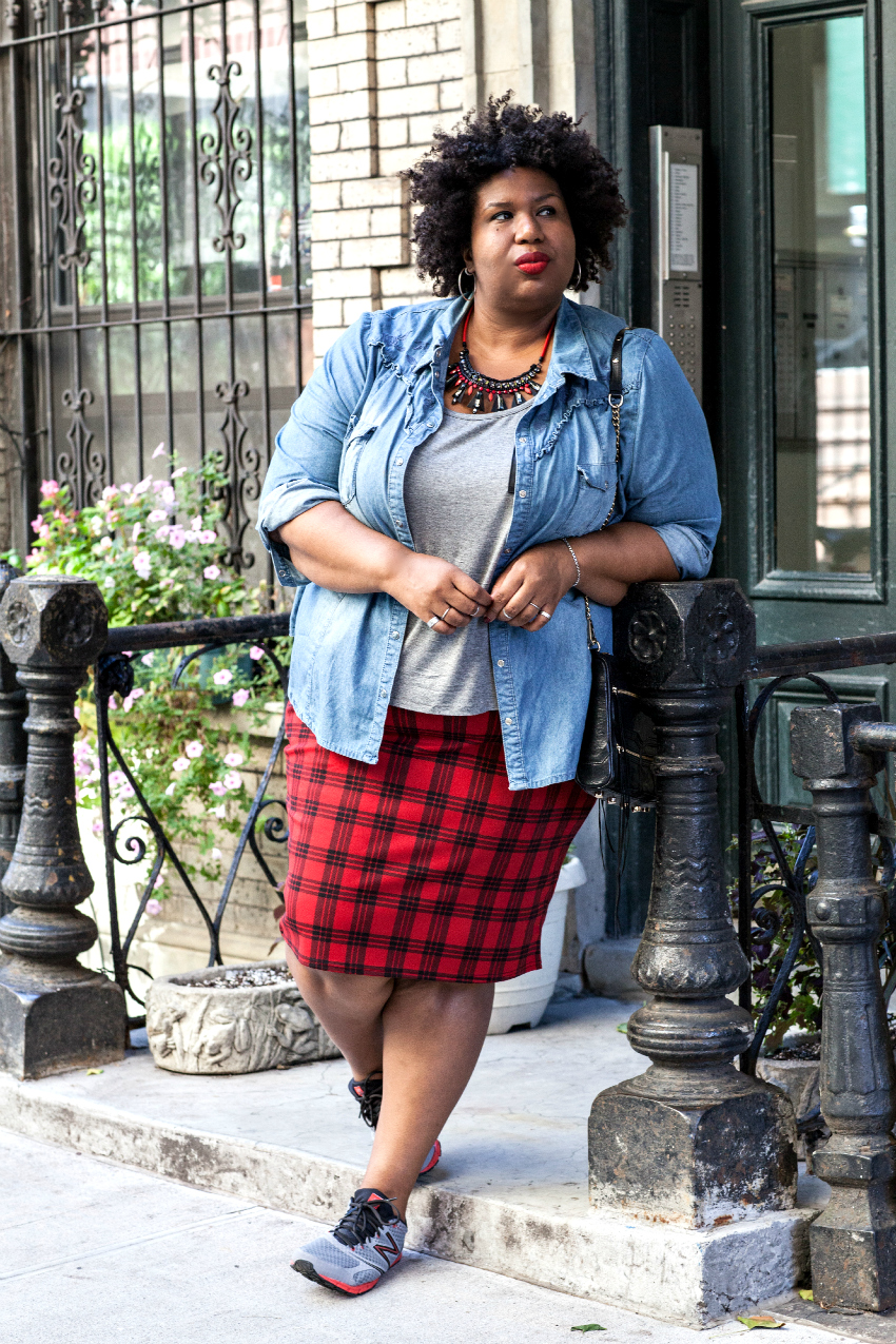 Chambray (similar here), Tee: Ellen Tracy, Plaid Skirt c/o Simply Be, New Balance Sneakers, Necklace: Topshop