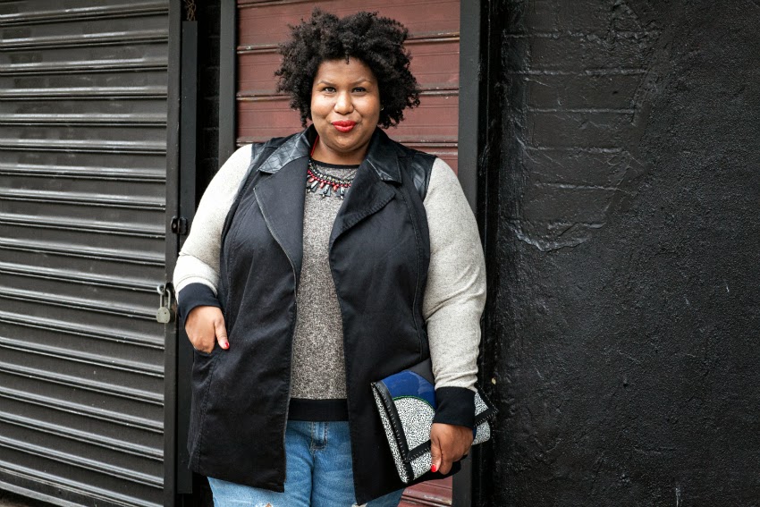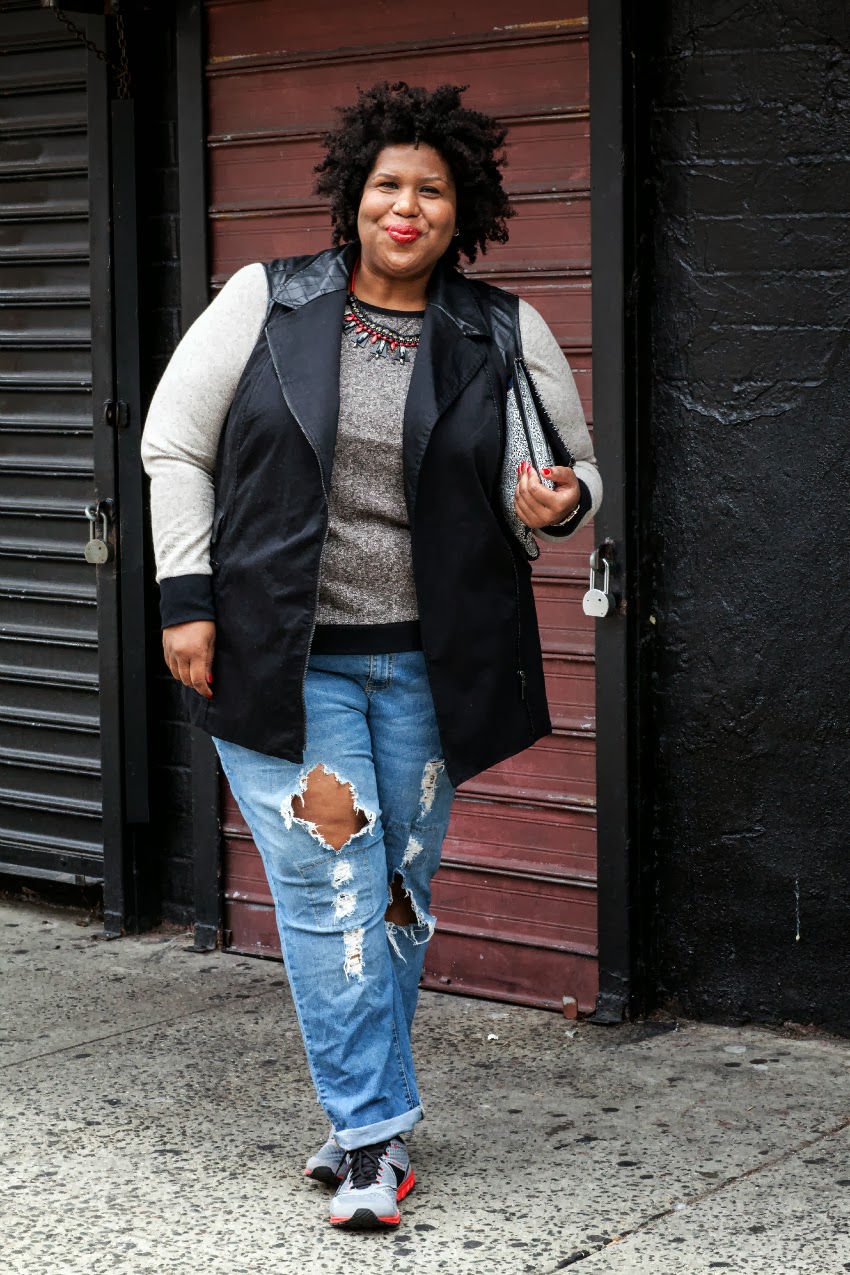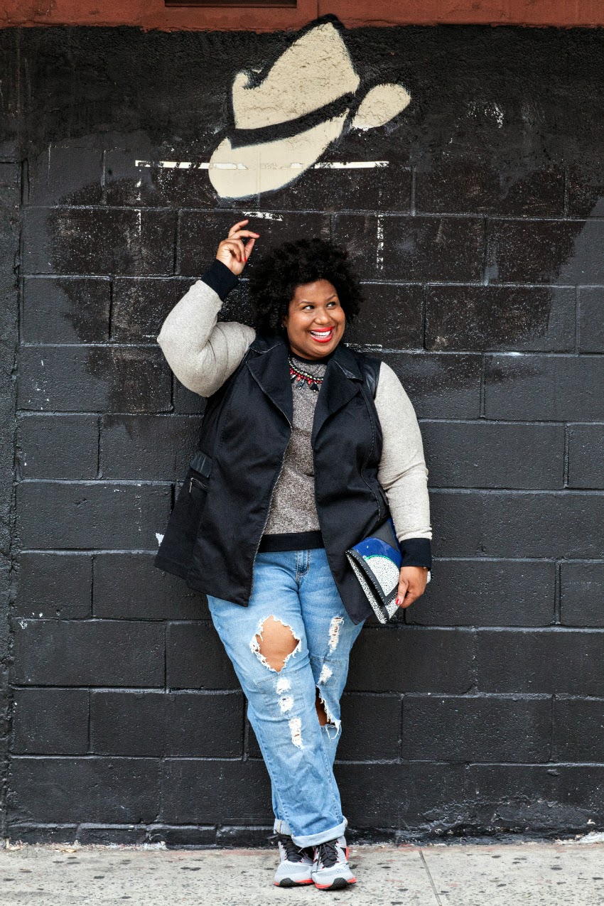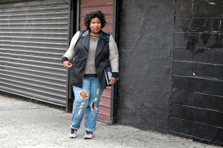 Berlin Vest: c/o MYNT 1972, Heathered Tonal Sweatshirt, Ripped Boyfriend Jeans, Print Clash Clutch: ASOS, New Balance Sneakers, Necklace: Topshop