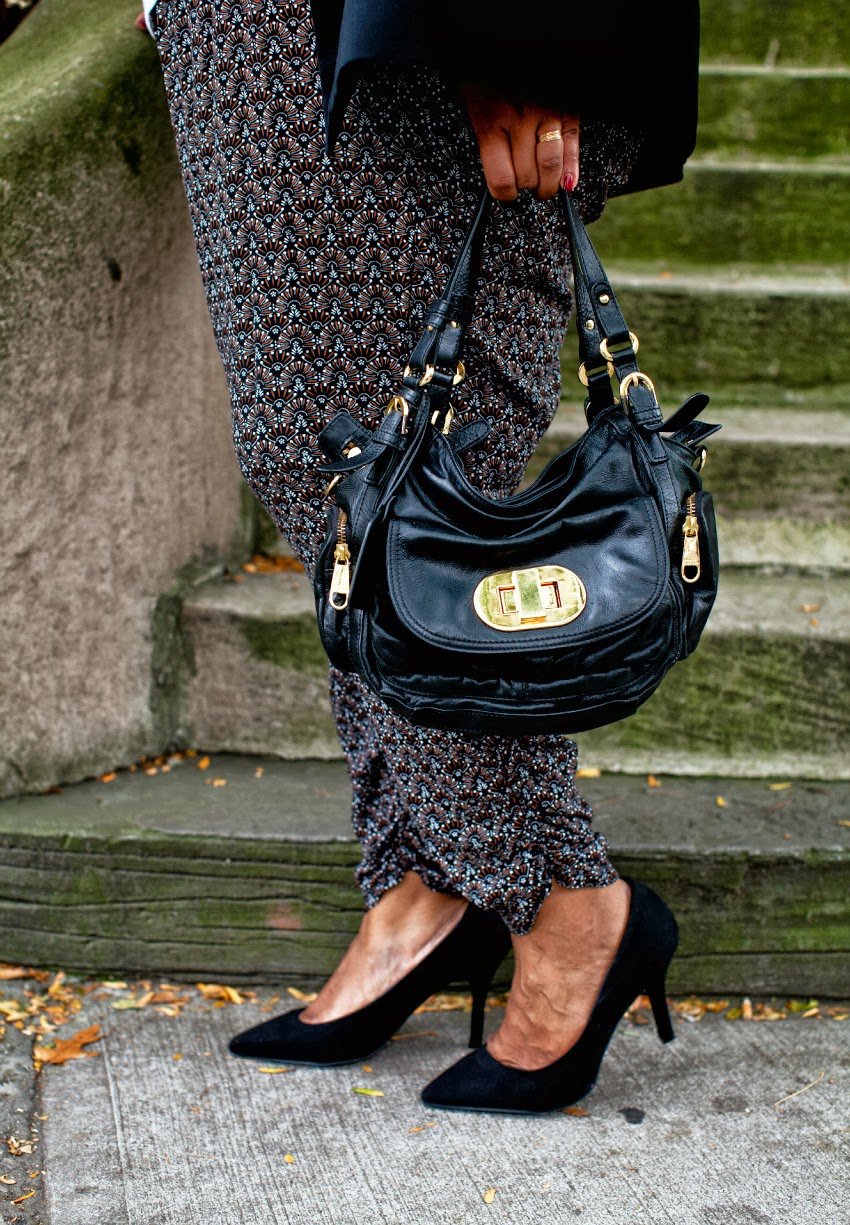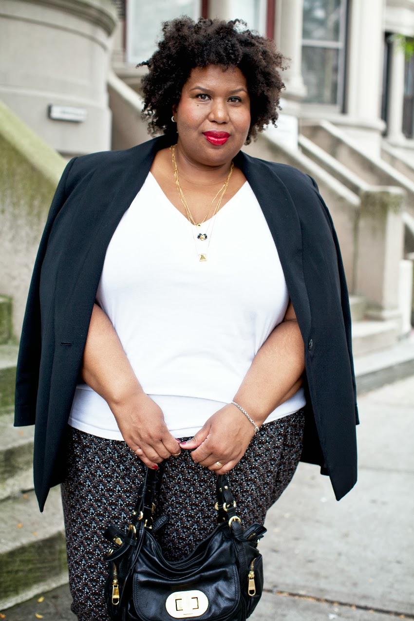 Crisp Black Blazer, White T-shirt, Pants: Evans, Bag: Badgley Mischka, Pointy Pumps