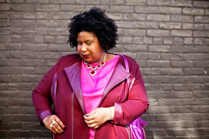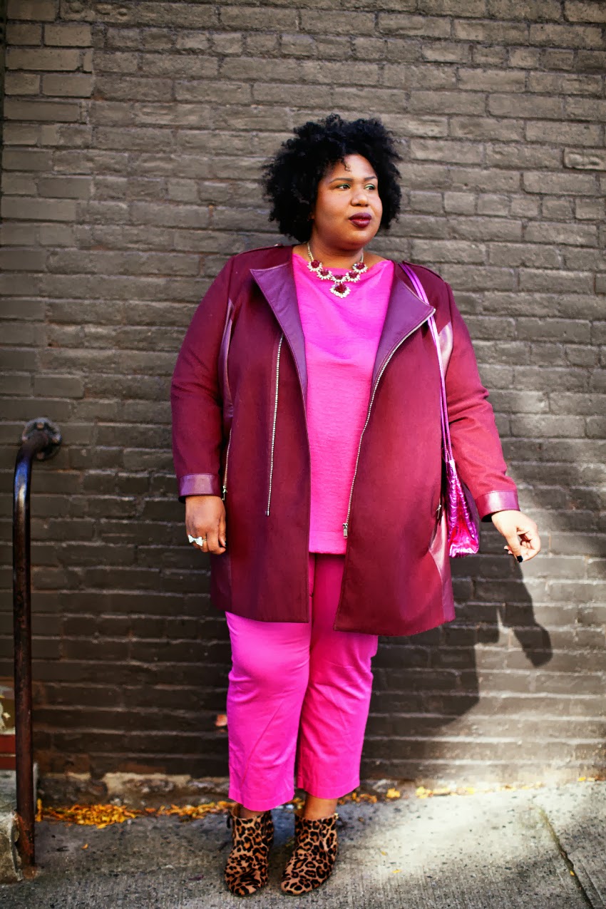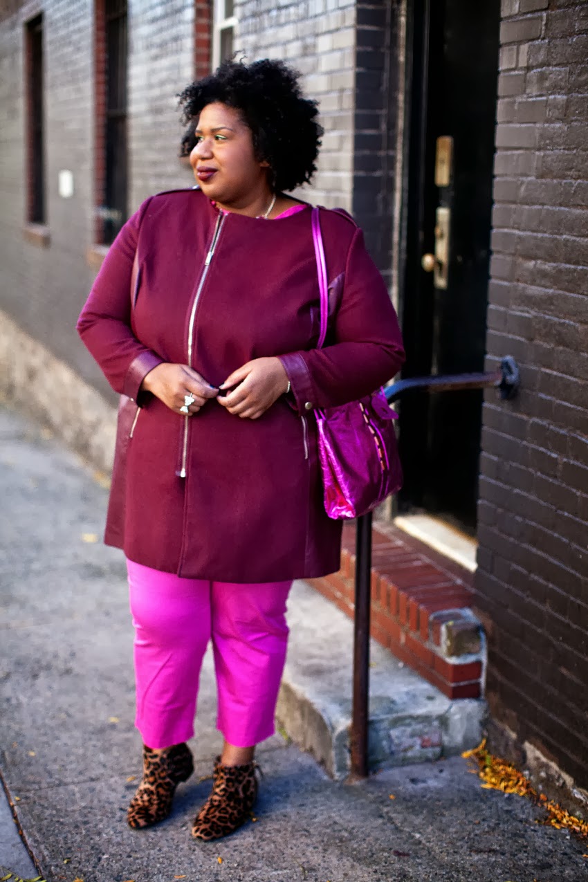 Coat: c/o Simply Be, Pink Top: Old Navy (similar), Pants: Avenue (old), Leopard Booties: NineWest via BarefootTess.com (similar), Bag: Marc Jacobs Collection (2011ish)