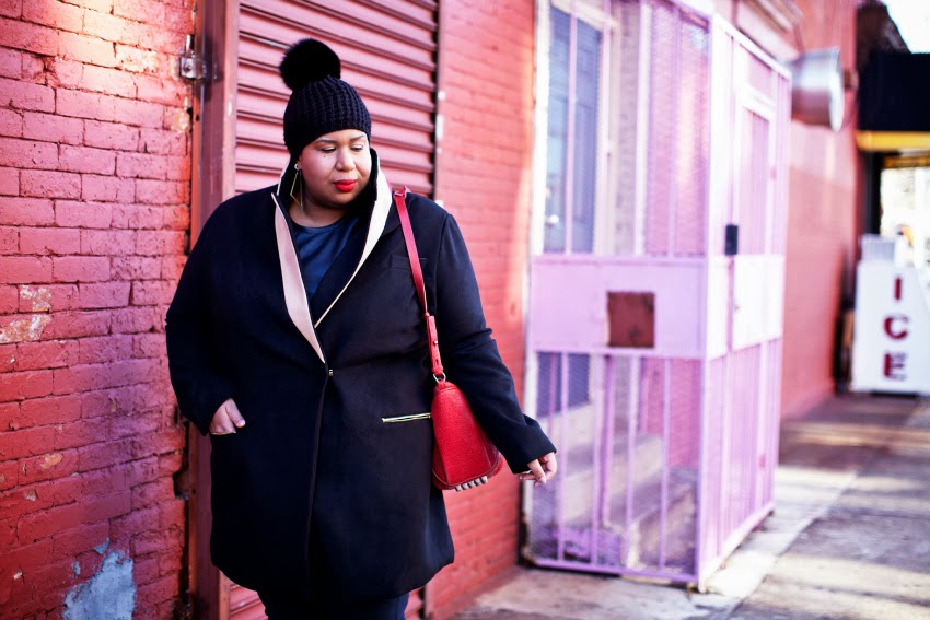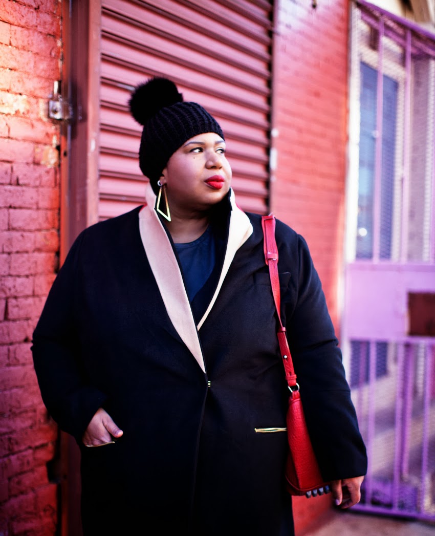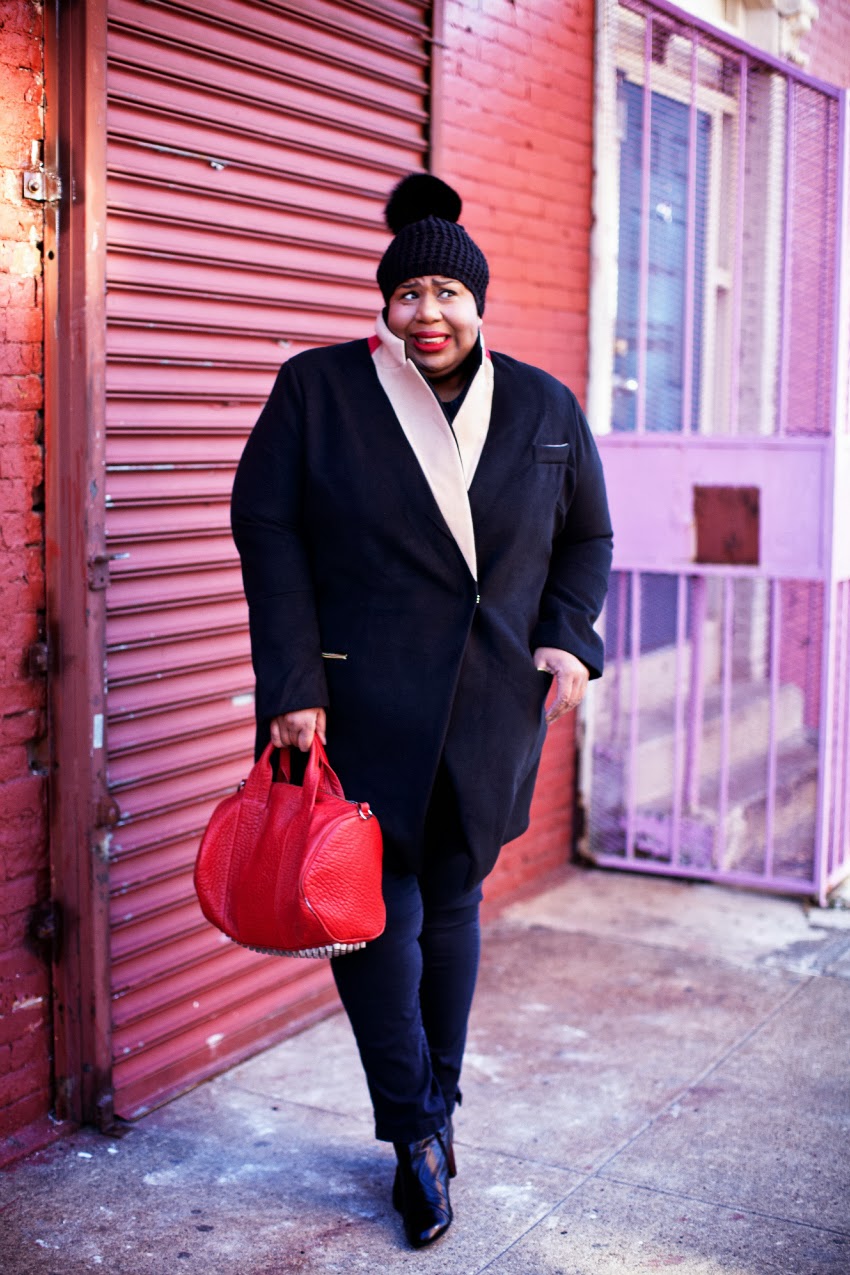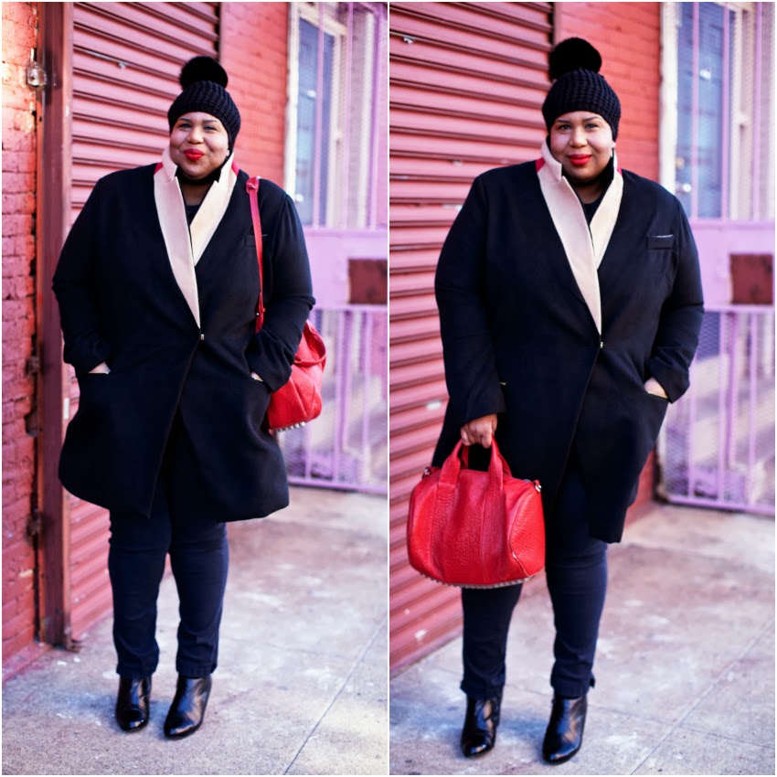 ASOS Curve Coat with Contrast Trim c/o, MYNT 1792 Leather T-shirt c/o, Black Skinny Jeans, Alexander Wang Rocco Bag, Beanie w Fur Pom via Monmarte, Rachel Roy Earrings