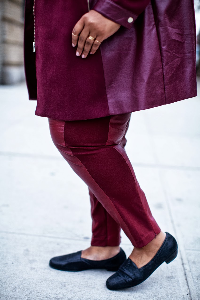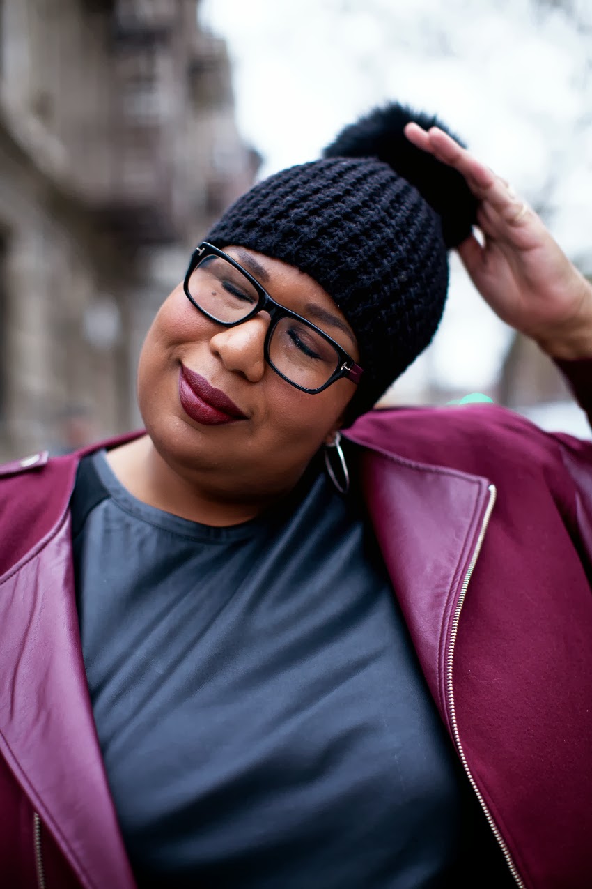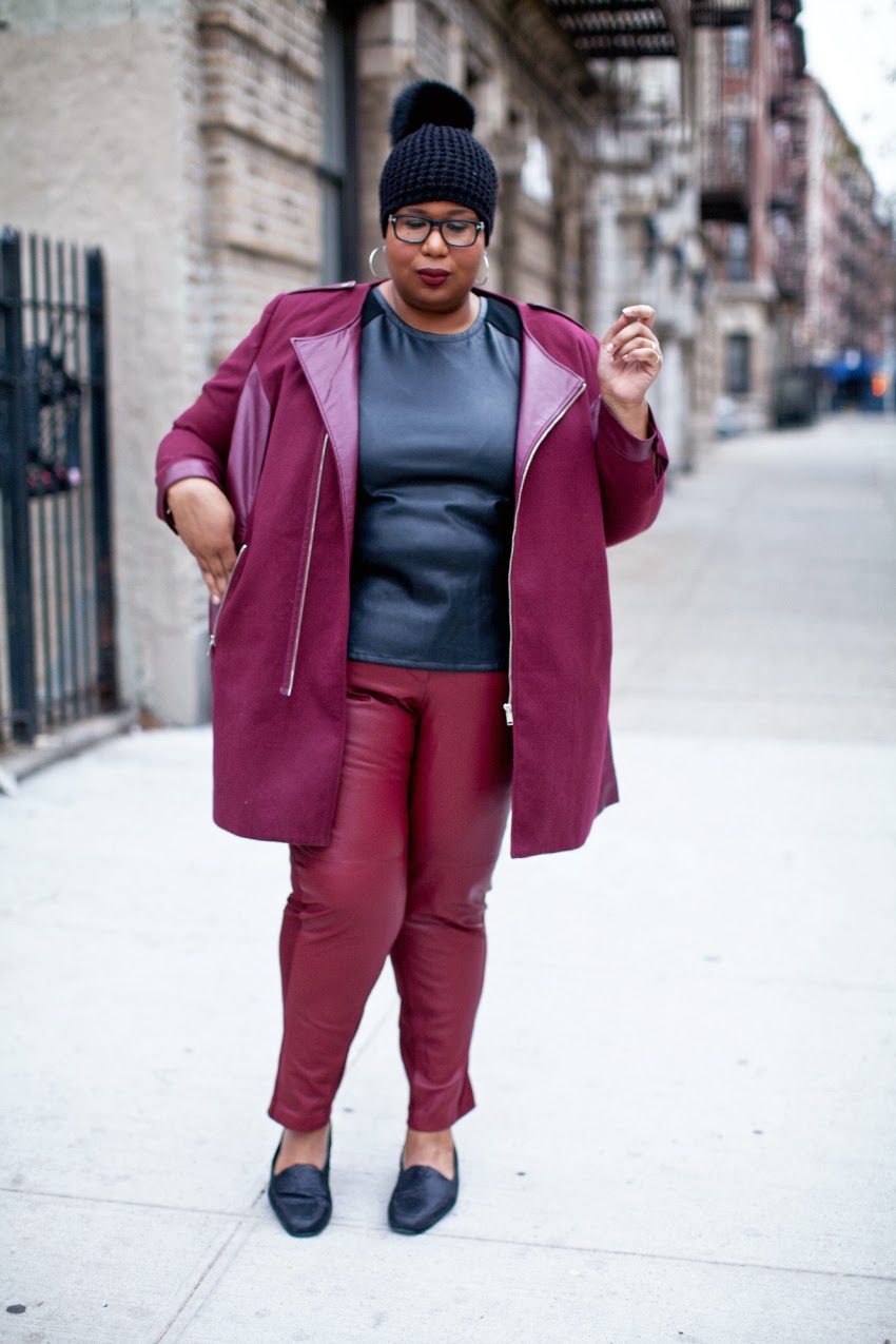 Coat: c/o Simply Be, Leather Tee: c/o MYNT 1792, Leather Pants: ASOS Curve (on sale!), Sparkle Loafers via Nordstrom Rack, Fur Pom Beanie via Monmarte