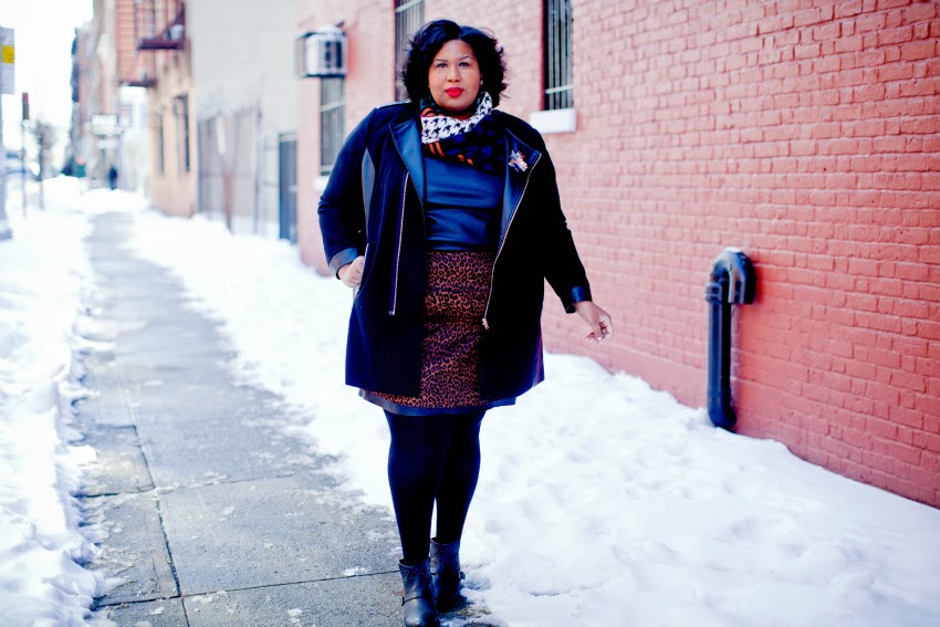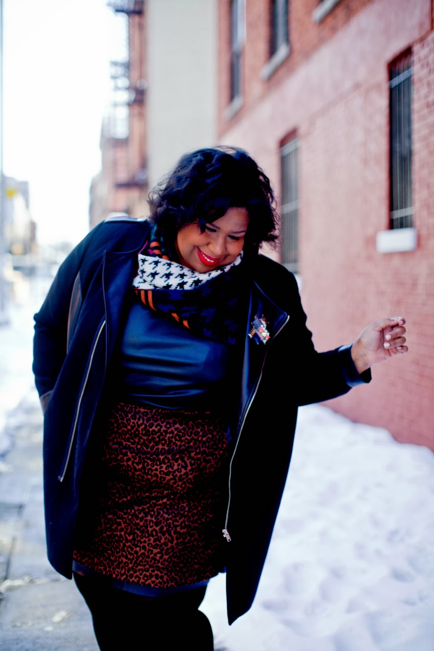 Coat: Simply Be, Leather Tee and Leopard Skirt: c/o MYNT 1792, Scarf: Zara