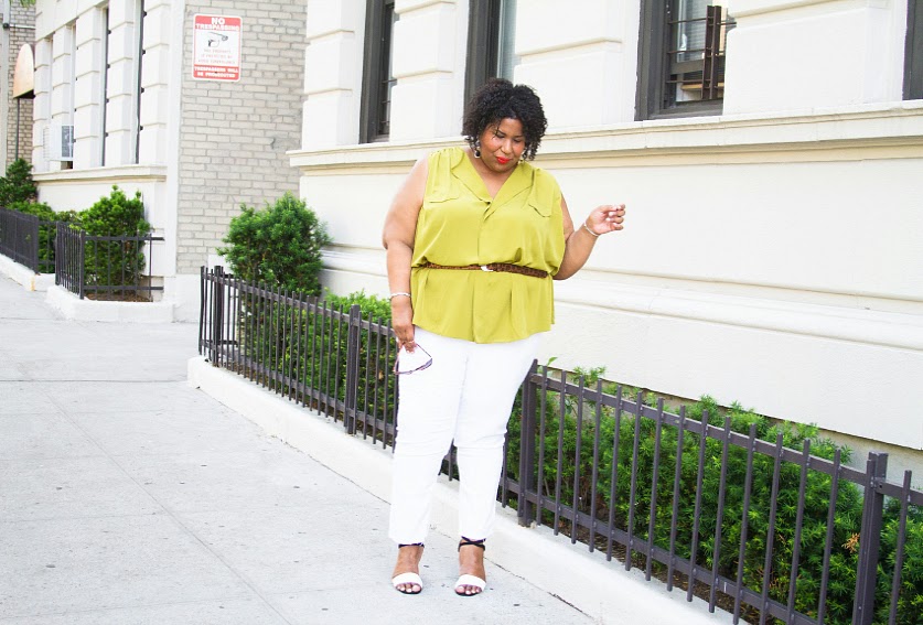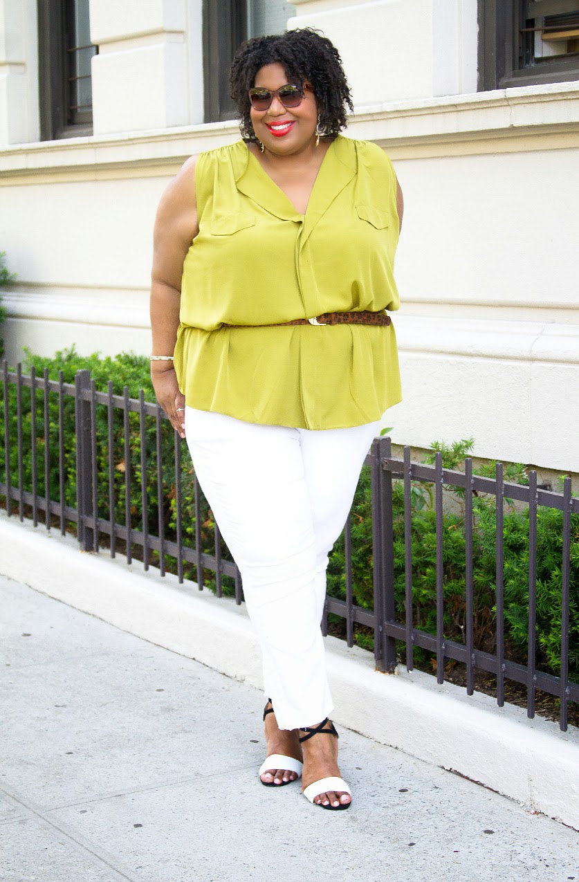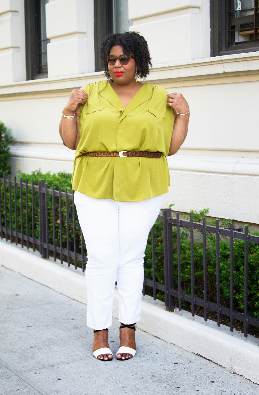 ASOS Curve Exclusive Blouse with Drop Neck, Plus Size White Jeans via Macy’s, Belt c/o Simply Be (old) lots of great plus size belts here, Prada Sunglasses