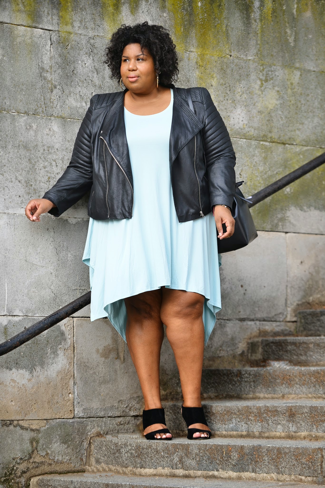 Mylene Handkerchief-Hem Dress: BCBG Maxazria, Leather Jacket: ASOS Curve, Mansur Gavriel Buck Bag, Shoes: Shoeissma (n/a)
