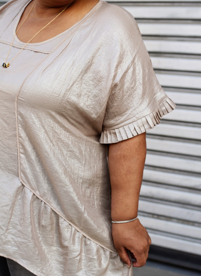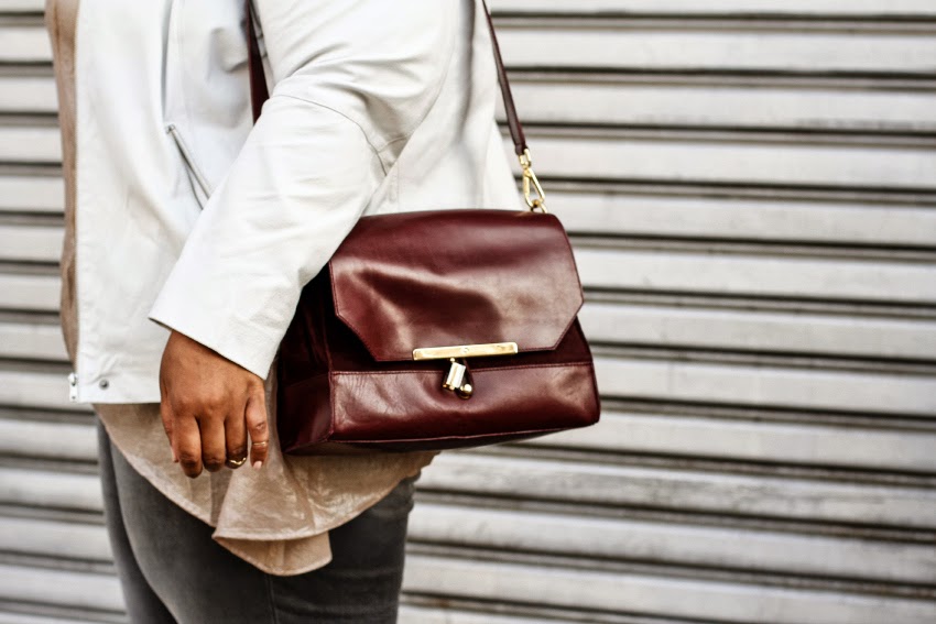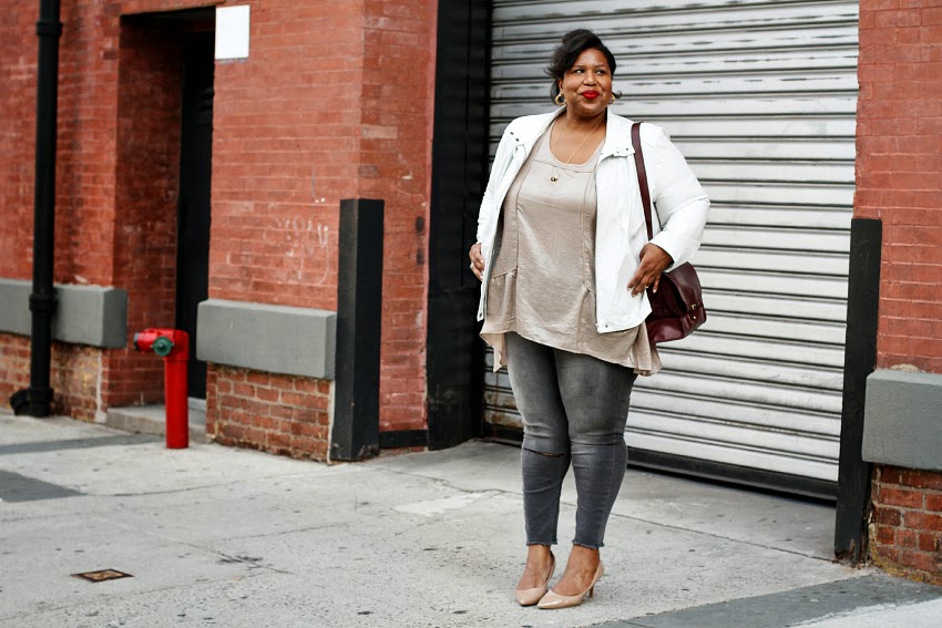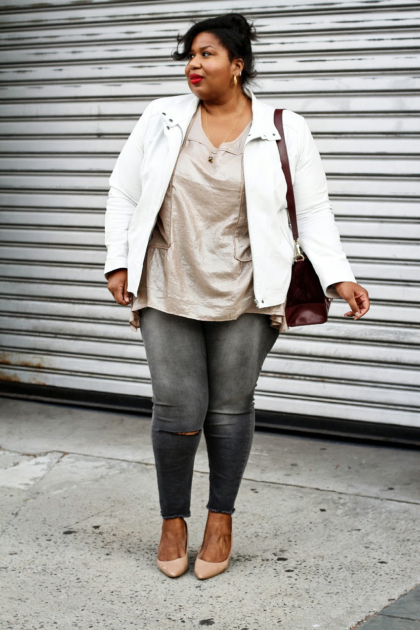 White Biker Jacket (similar here, here and here), Pleated Tunic: Isabel Toledo c/o Lane Bryant, Grey Jeans: ASOS Curve, Bag: Zara, Nude Pumps