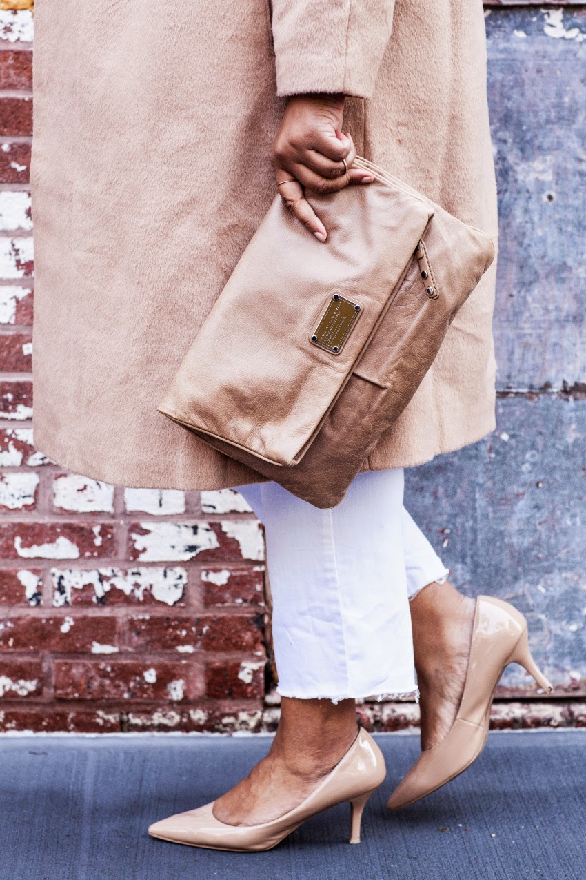 Relaxed Fit Coat: ASOS Curve, White Jeans (mine are cut off, just snip the ends with scissors), similar Nude Pumps