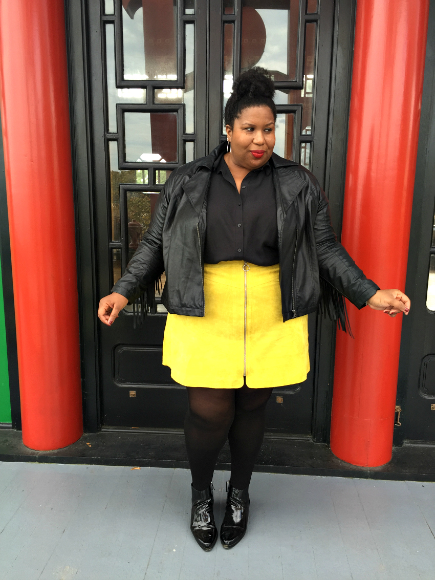 Fringe Moto Jacket(similar) | Sheer Blouse | Suede A-line Skirt