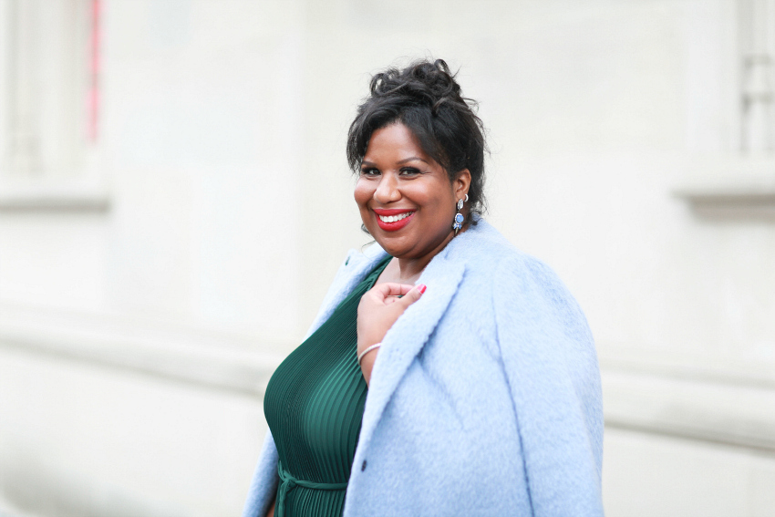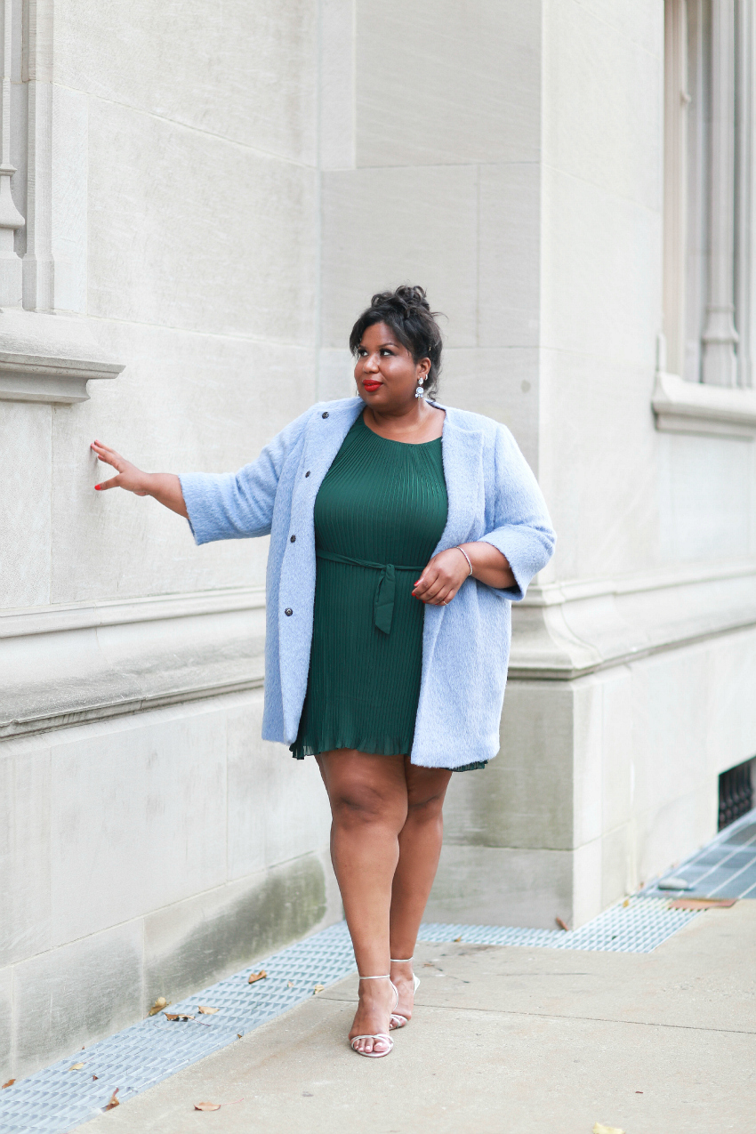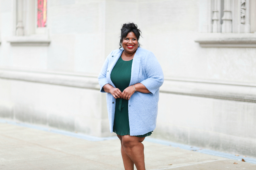 Coat, Persona by Marina Rinaldi | Dress, Lovedrobe both c/o Navabi