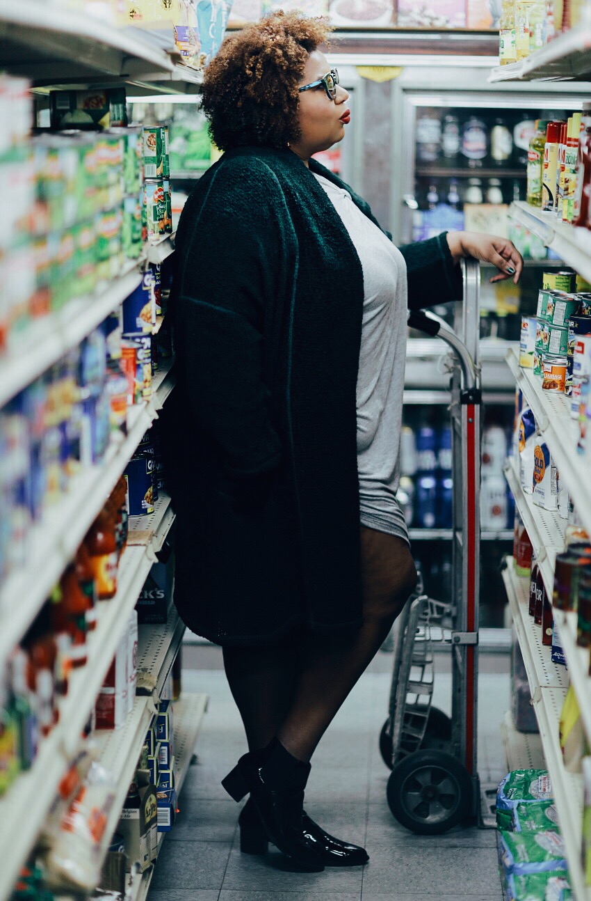 The dress I scored from the BCBG store years ago, it’s a size 14 I just ripped the thigh to fit me. Love the twisted neck top. What I love about the cardigan is the gorgeous green color and minty piping. Cozy, cool…and looking for snacks.