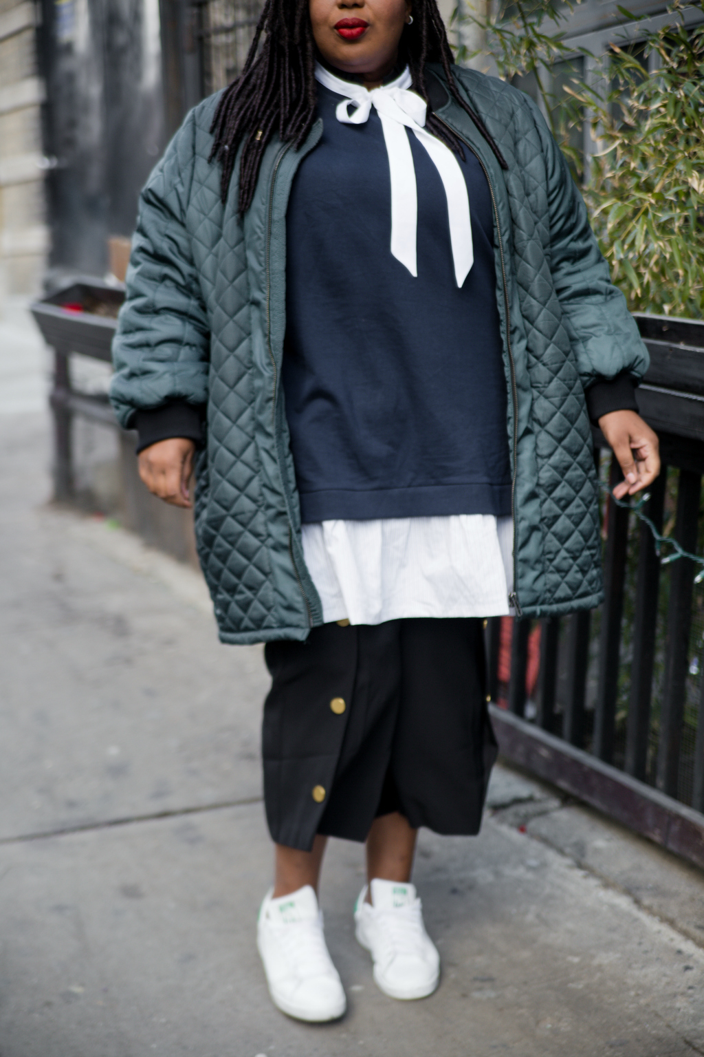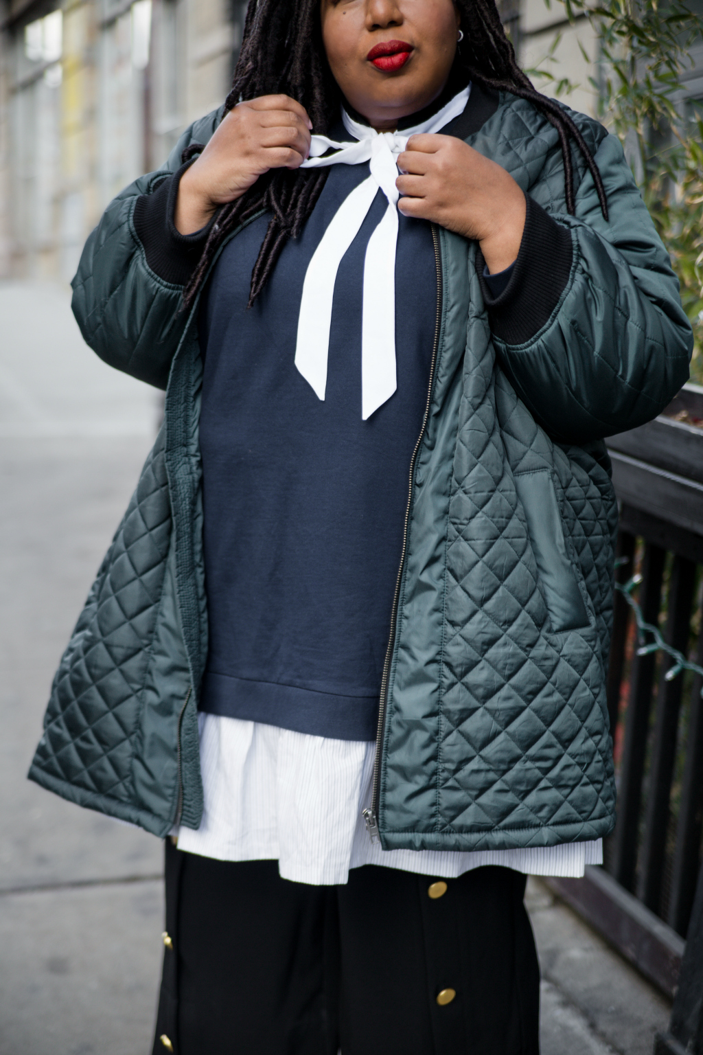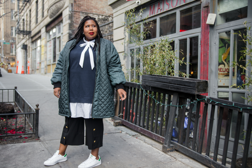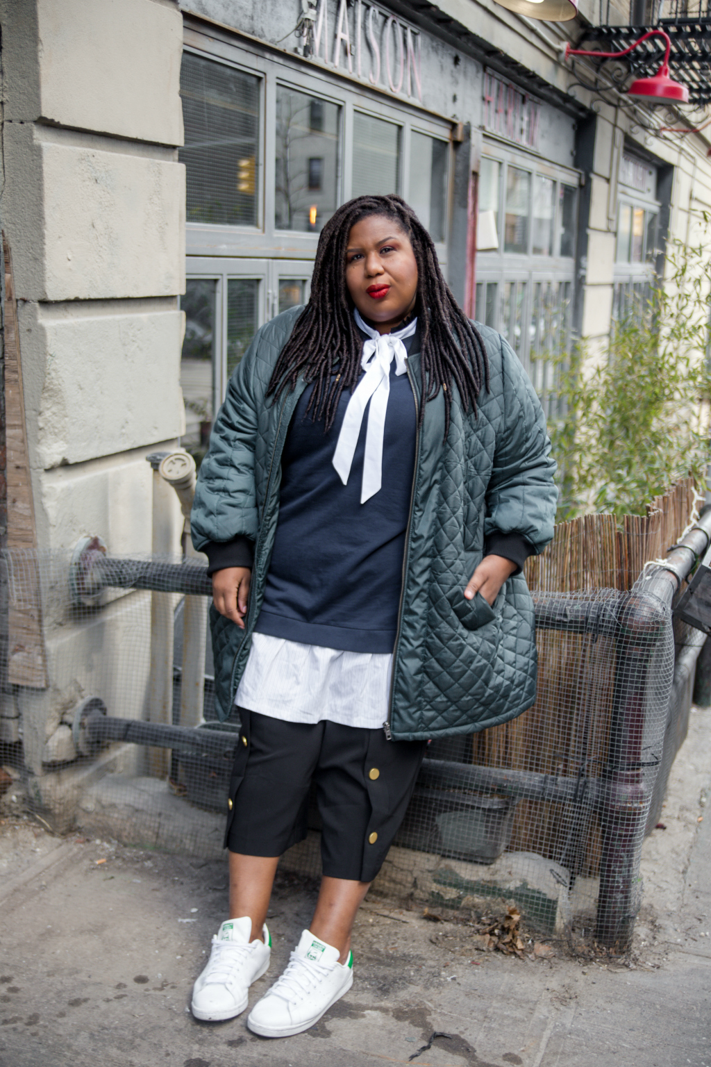 I’m basically wearing a lot of clothes. It was a little chilly on this day so I decided thin layers would be the way to go. I was also a bit in a mood and didn’t want any clothing actually touching my body (am I the only one who gets that way?) So rather than an arrest for public nudity, I opted for relaxed er’thang. The sweatshirt dress with attached shirt tail is one piece, the bow you see peaking out of my neck is part of a comfy sack dress and my button front cropped trousers have been living in my closet for a few months and now I can’t put them down! Topped it off with my favorite oversized long bomber and voila, “suuups French”. Kinda, ha!