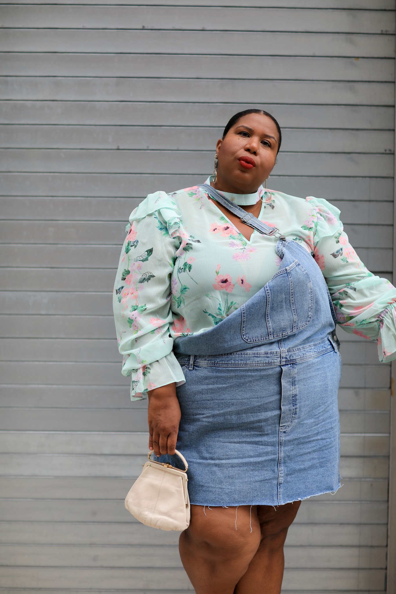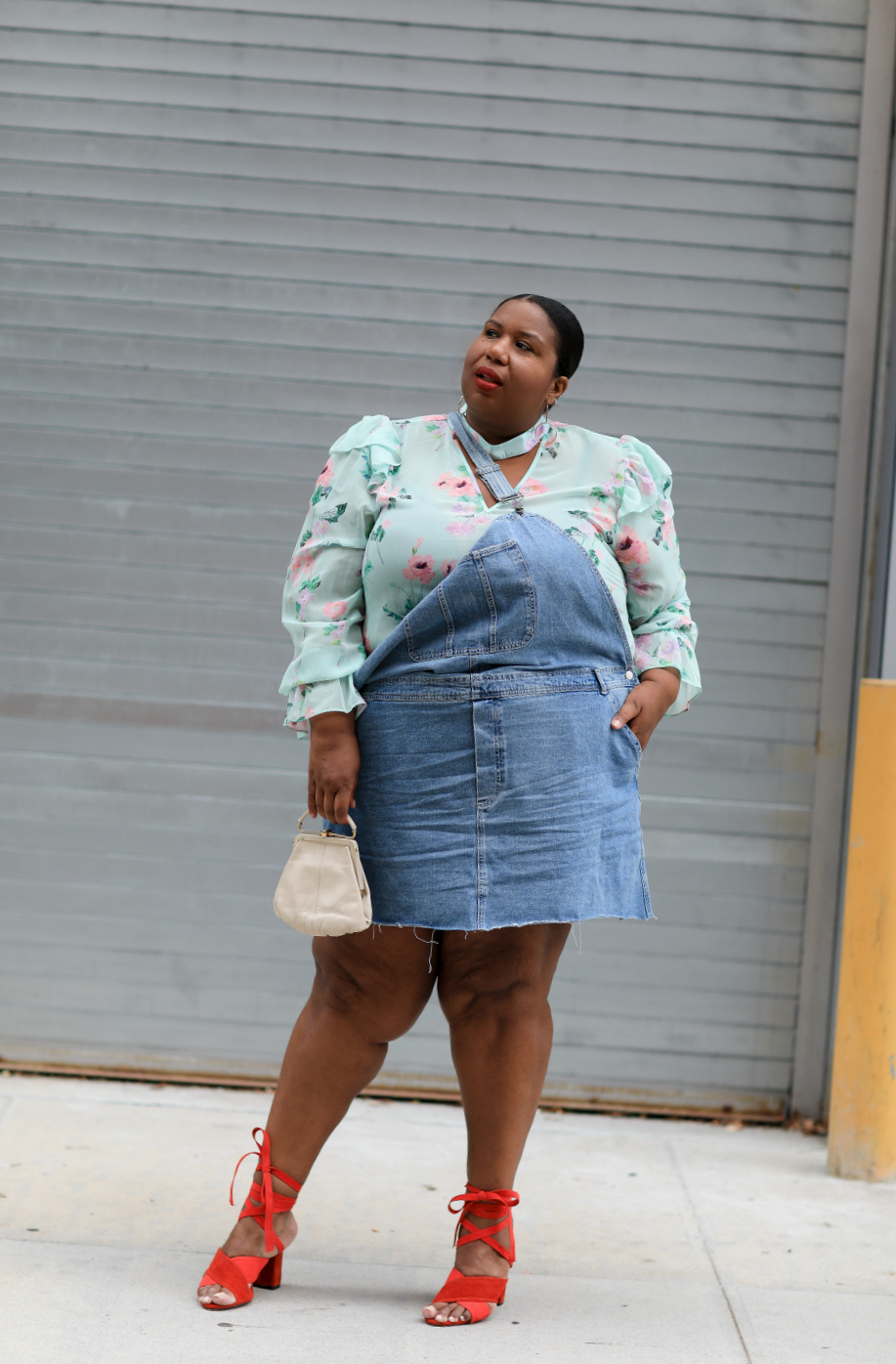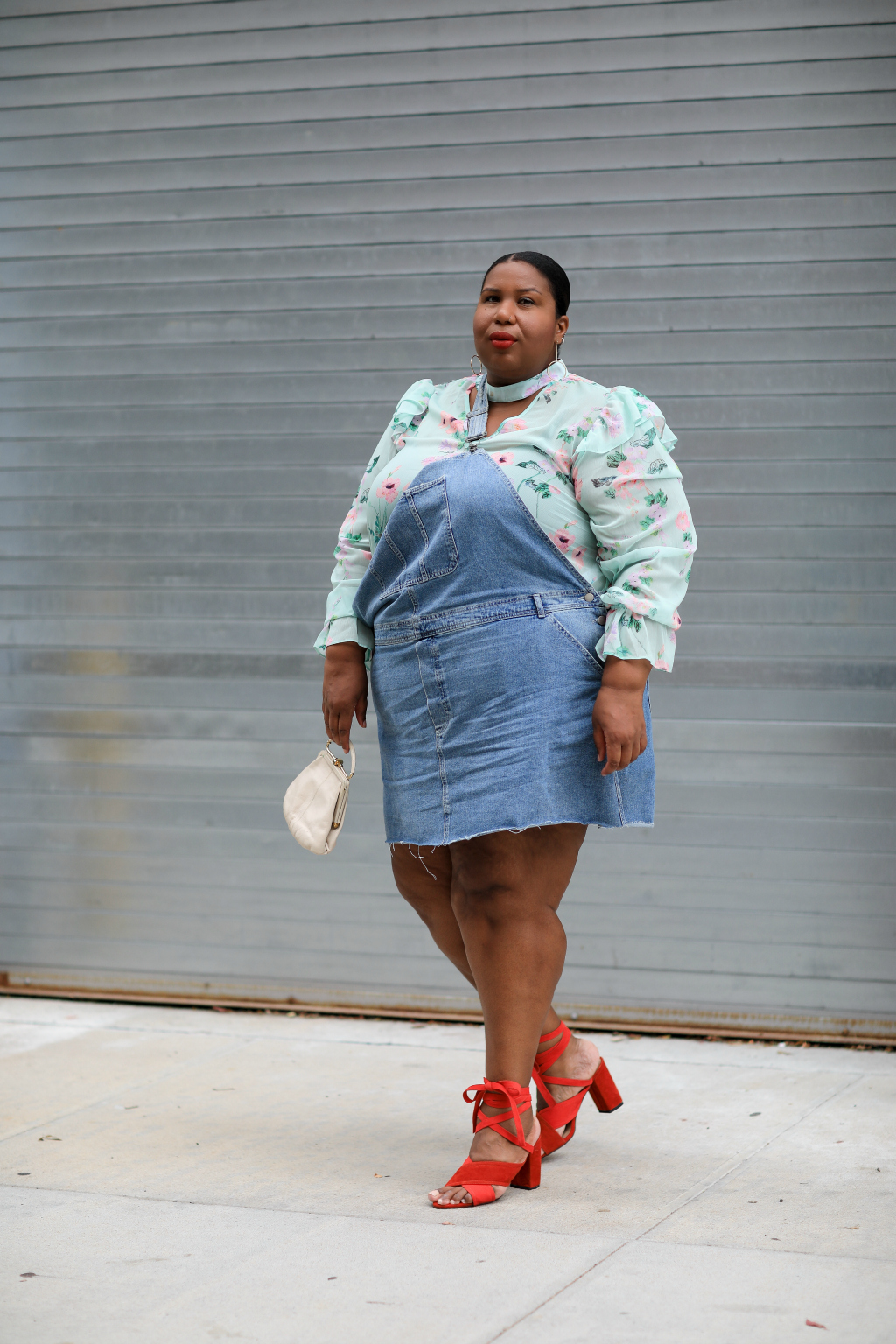 Denim Overalls | Floral Blouse | Vintage YSL Clutch | Earrings | similar Red Strappy Sandal